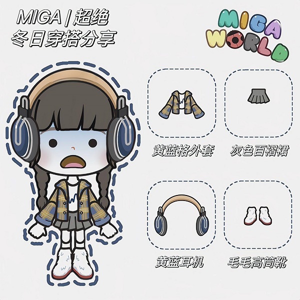 5、黄蓝格纹外套搭配灰色百褶裙,再配上黄蓝配色耳机与毛绒高筒靴。