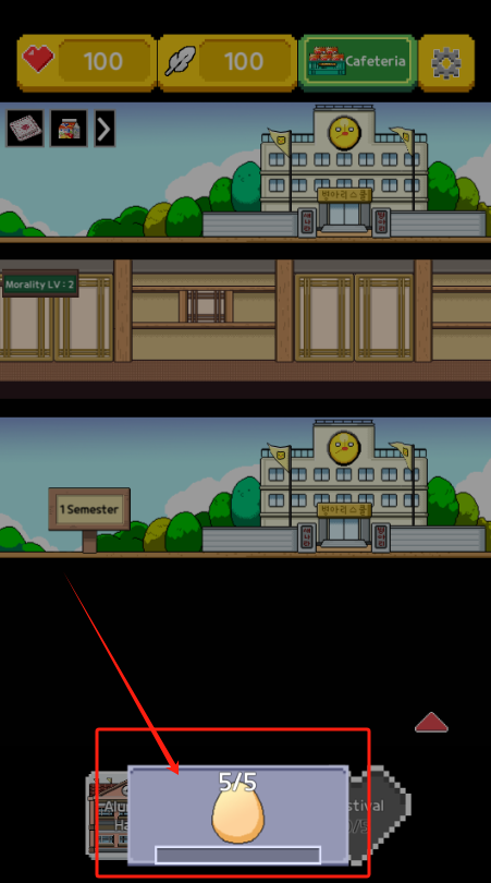 3、主游戏界面,顶部展示生命值与资源,中间呈现学期进度,底部红框内为待孵化的鸡蛋。