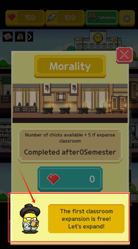 2、教室扩建提示,点Lets expand可以免费扩建一次,能多收5只小鸡学生。