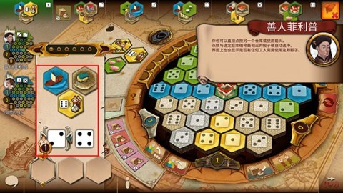1、游戏开始后的第一个步骤是从对应编号的仓库购买牌片,仓库编号需与你掷骰子得到的点数相同。购得的牌片必须放入你的储存格内(储存格共有3个)。