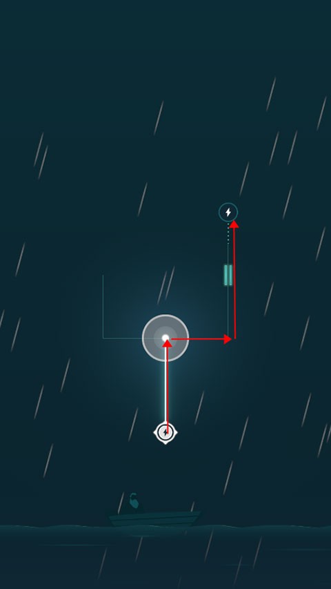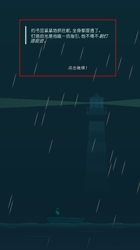 3、主角约书亚在风雨中驾驶小船,唯一的目标就是远方的灯塔。浪很大,你得不断修正航向,小心别被冲走。