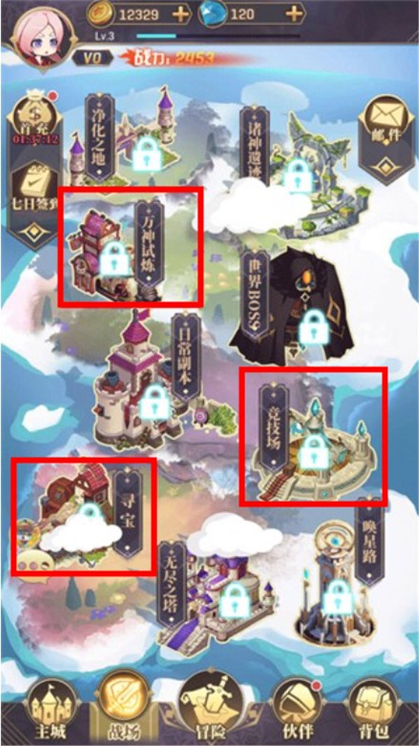 游戏中设有主线推图玩法,同时还有诸神遗迹挑战、寻宝探险、万神试炼等特色内容可供体验。