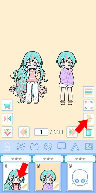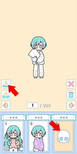 4、进入下方界面后,点击之前保存的搭配即可将角色展示在屏幕上,长按可移动角色,向下滑动至垃圾桶按钮可删除角色。若要返回搭配界面,再次点击右侧第三个按钮即可。