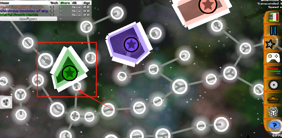 3、注意不同颜色的六边形区域,绿色是你的地盘,点它们能管理星球。