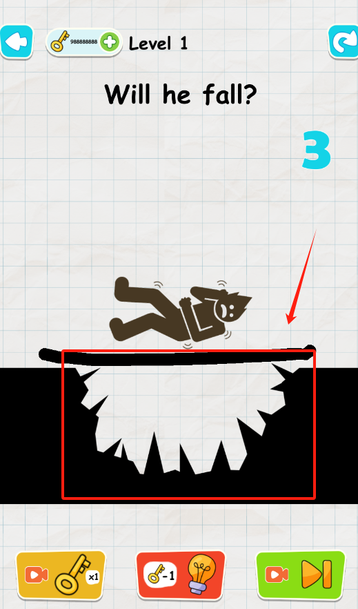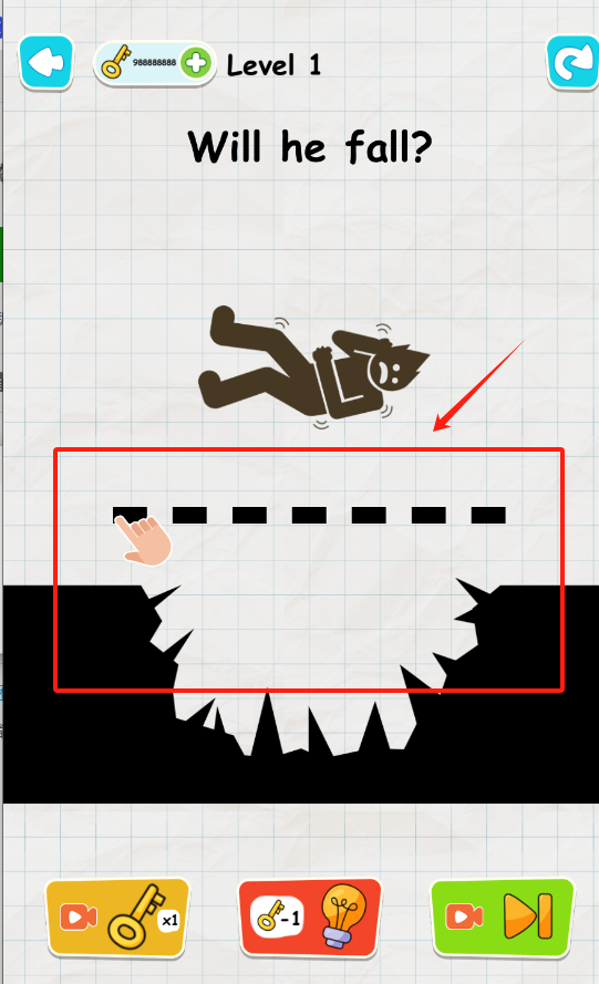 2、火柴人马上要掉下去了,快点击手指图标救他,千万别让他掉进锯齿缺口里。