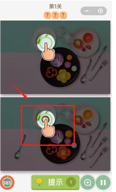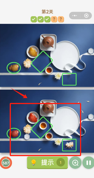 2、仔细找出全部5处不同的地方后,准确点击对应的位置完成标记和确认操作。