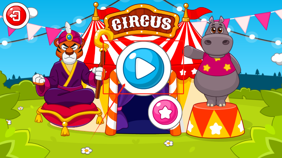 1、点击红白相间帐篷前的绿色播放按钮,观看老虎与河马的马戏表演,星星即为奖励。