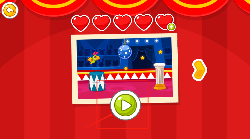 2、点击中间相框上的绿色播放按钮,观看小鸟马戏表演,其中红心代表生命值。