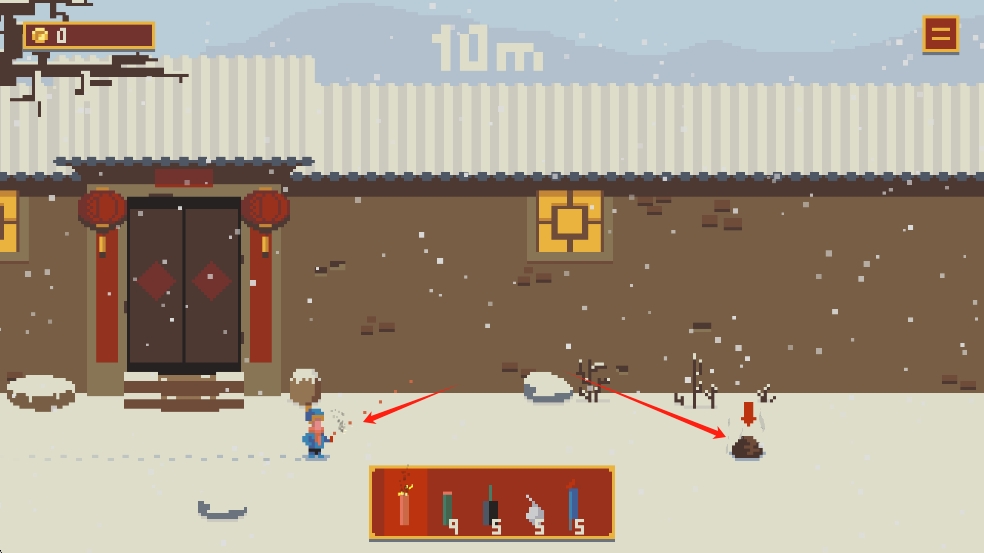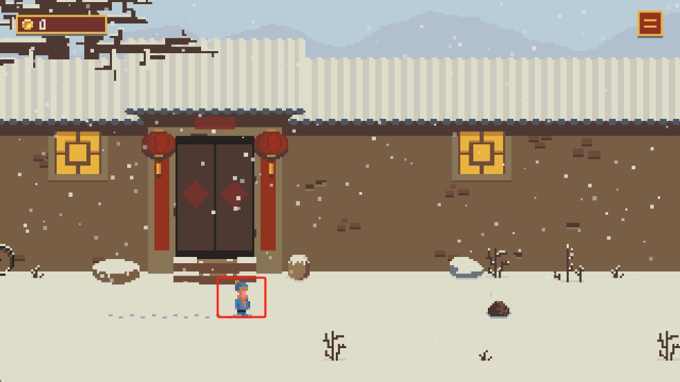 1游戏开始时,你需要操控位于红色方框区域内、身着蓝色服装的角色,在积雪覆盖的庭院场景中移动。当角色靠近道具栏中的物品或场景里的各类元素时,就能触发相应的互动机制。