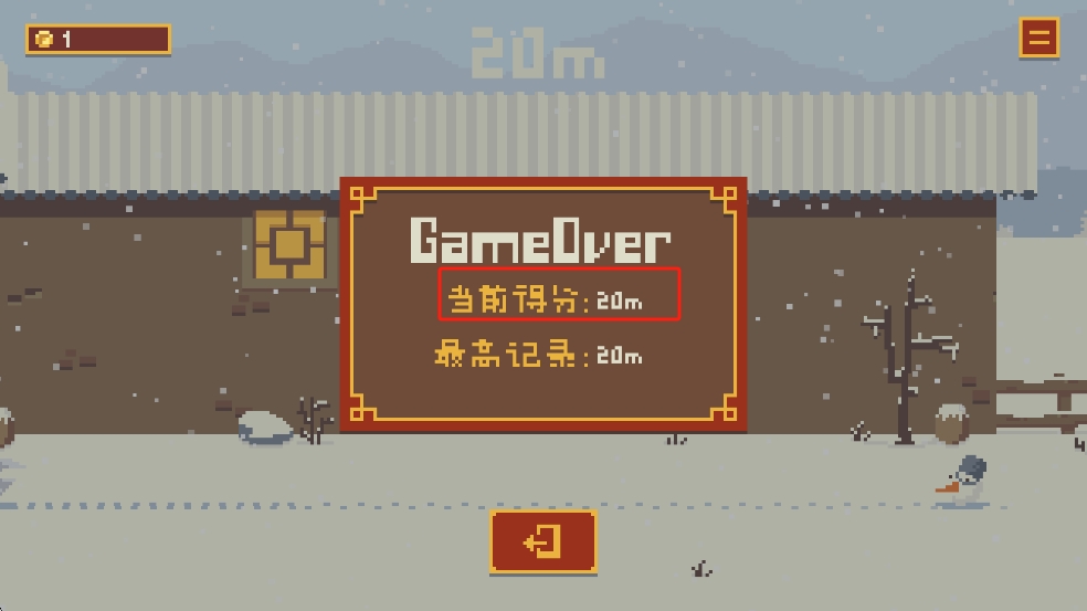 3、游戏结束后,查看红色方框内显示的当前得分20m,点击下方按钮,还可以重新挑战突破记录。