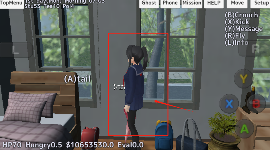 3、女生站在窗边床上,按B蹲下X踢腿,下面显示血量饥饿值,名字叫Tomoka。