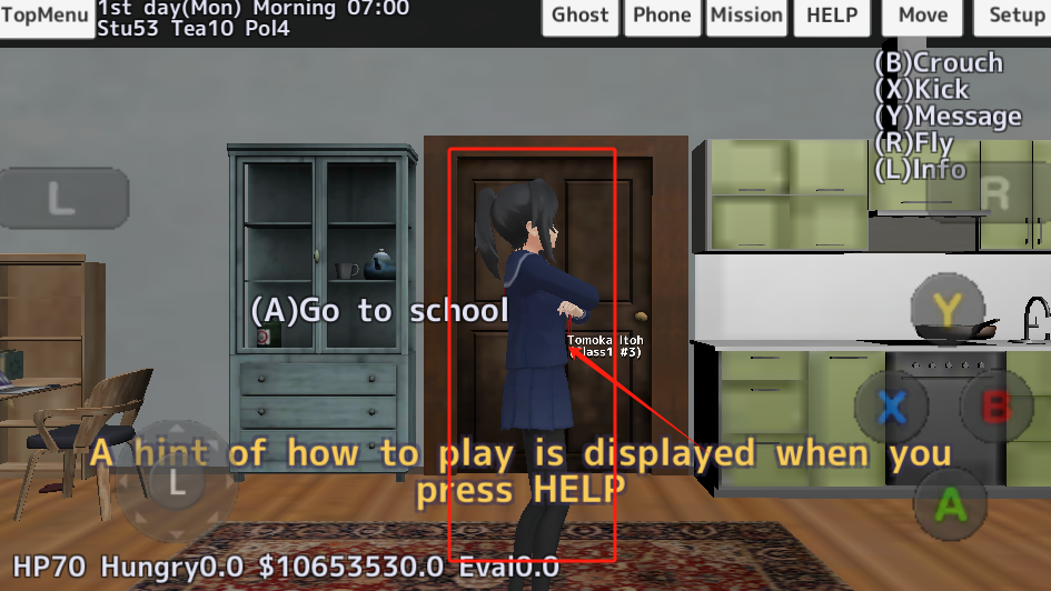 2、控制穿校服的女生在房间里走动,按HELP看操作说明,右上角显示周一早上7点。