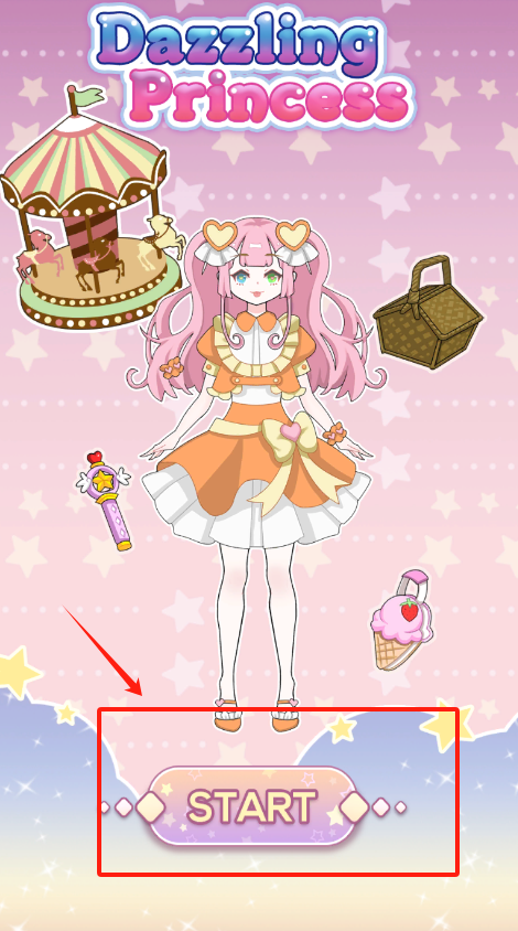 1、看到粉色星星背景里穿橙白裙的公主,底部紫色START按钮,用手指点它就能开始游戏啦。