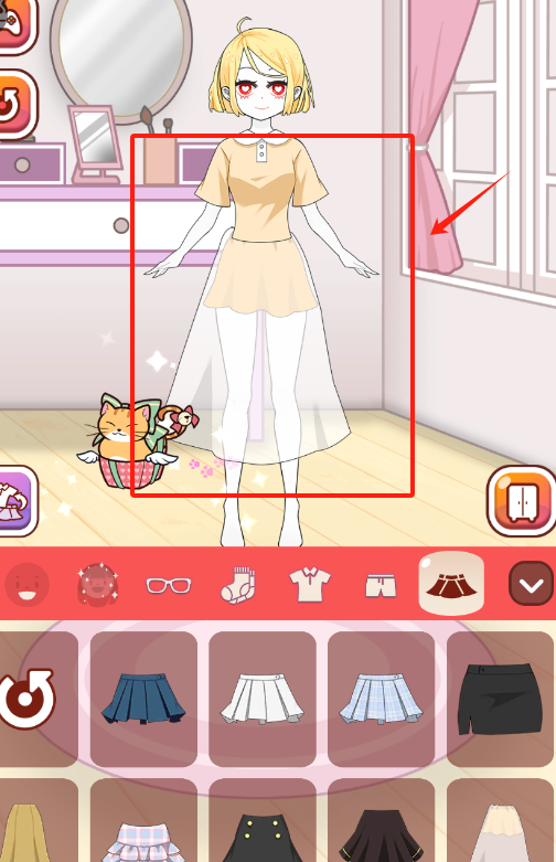 3、金发动漫女孩在温馨房间里,下方一排衣物选项里,挑个喜欢的裙子或服饰给她换上。
