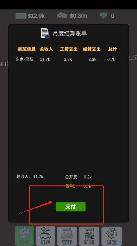 1、点击绿色的支付按钮,确认完成月度账单的结算操作,同时可以查看航班相关的收支明细。