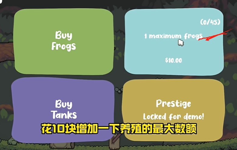 10、当赚到足够的钱时,购买更多青蛙,并通过扩建养殖场提升最大青蛙数量。