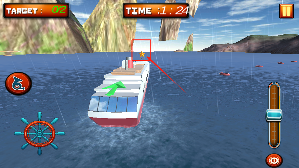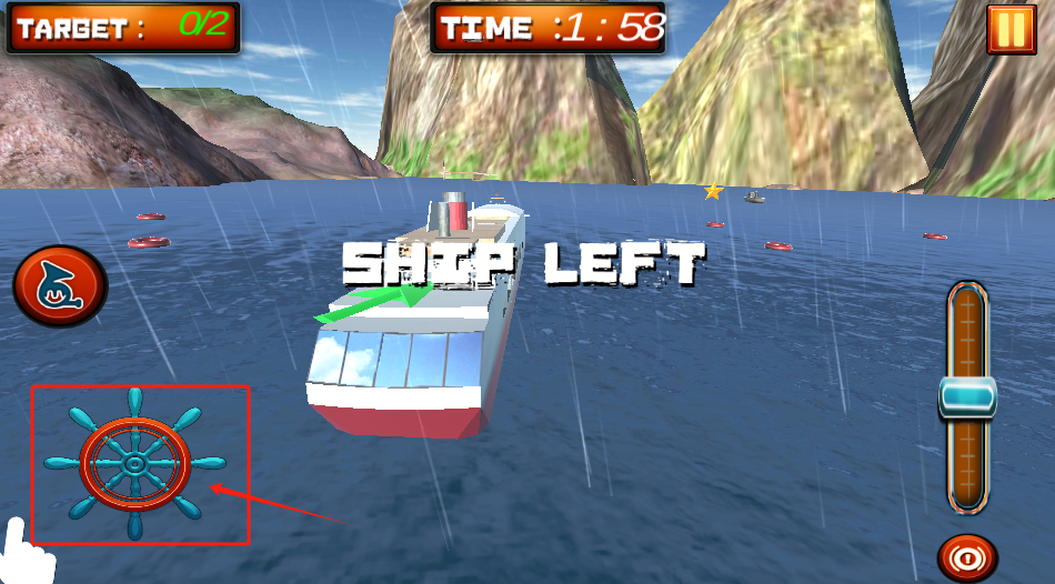 2、驾驶界面中,可通过左下角的转向图标操控船只方向,需在规定时间内完成目标02的任务。