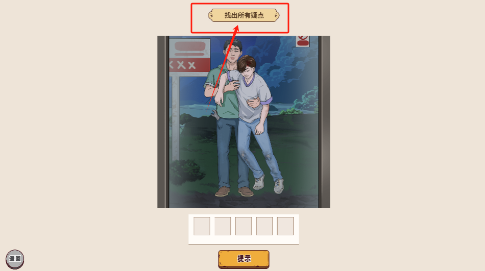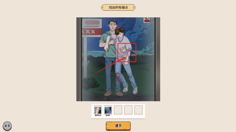 2、解谜场景中,留意两位男子互动的细节之处,点击可疑的地方来填满下方的五个空白格子。
