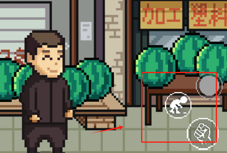 3、留意屏幕下方红框内的下蹲、出拳按钮,不用手指去按压它们,直接操控角色击打西瓜就可以了。