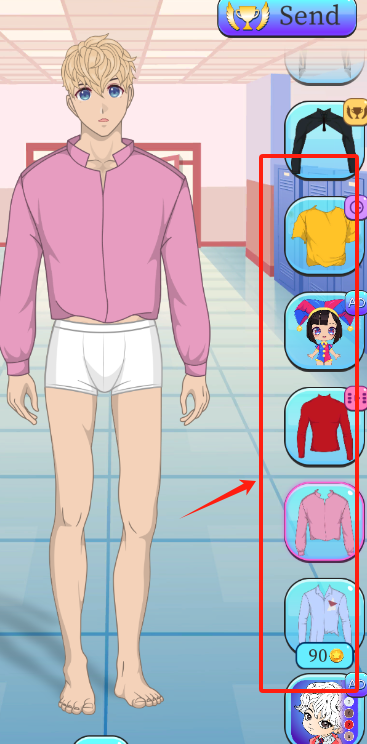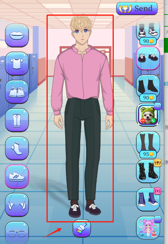 3、左侧选上衣短裤,右侧挑鞋子,价格标好了,点Send发送造型,广告别误触。