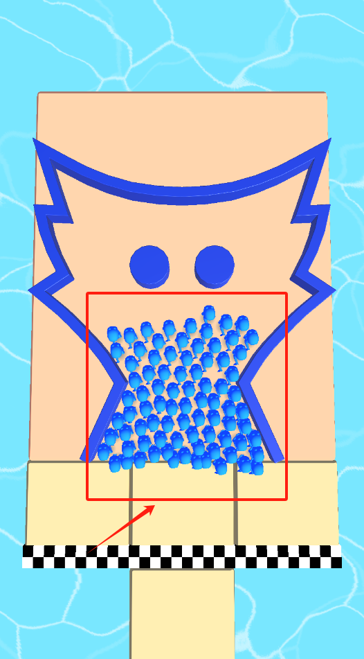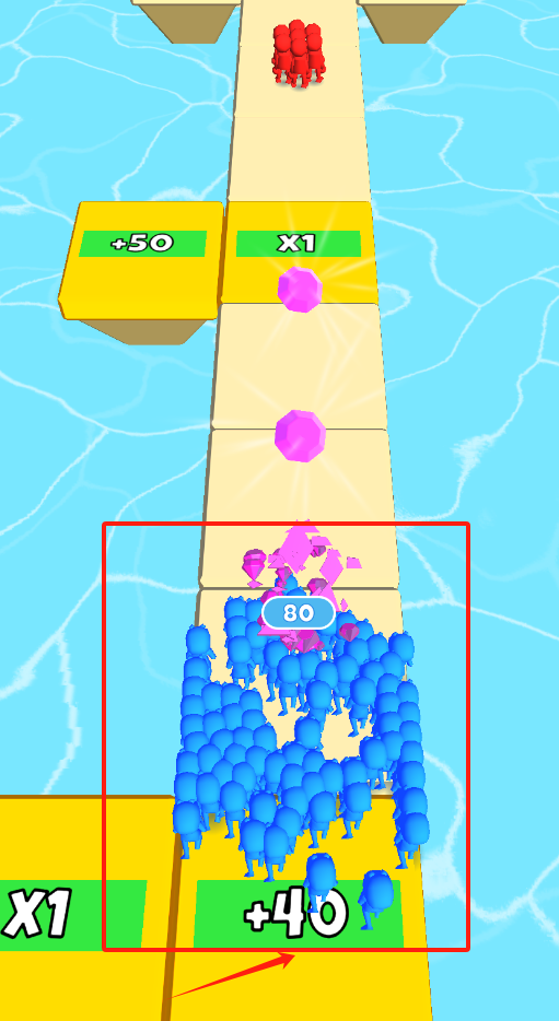 2、看到蓝色小人队伍在桥上前进时,点击屏幕操控他们躲开红色敌人,收集能加分的道具吧。