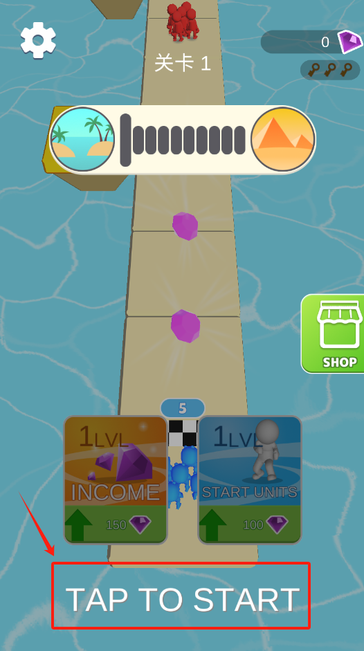 1、点击红色框内显眼的“TAP TO START”按钮开启游戏,操控小人队伍顺着蜿蜒的桥梁行进。