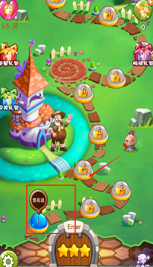 1、看到紫色小屋和您在这蓝色泡泡,点红框标记的绿色建筑就能进入游戏主场景啦。