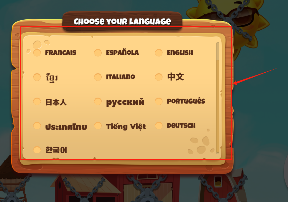 1、进入语言选择界面后,点击黄色框内你想要设置的语言(例如中文),即可完成游戏语言的切换。