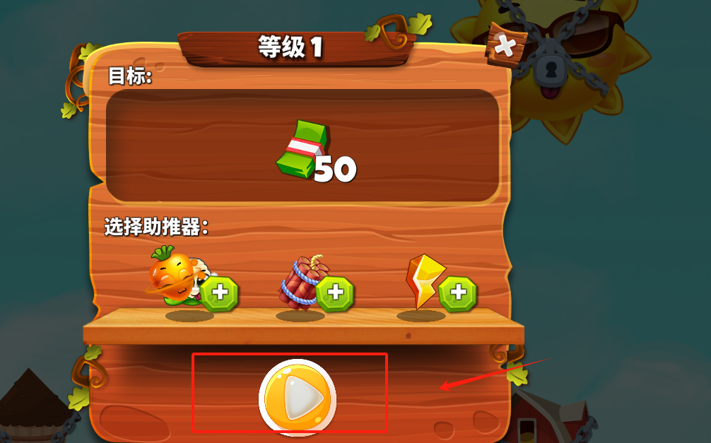 2、进入等级1的界面后,点击下方红色框内的黄色播放按钮,即可开启消除50个绿色物品的挑战。
