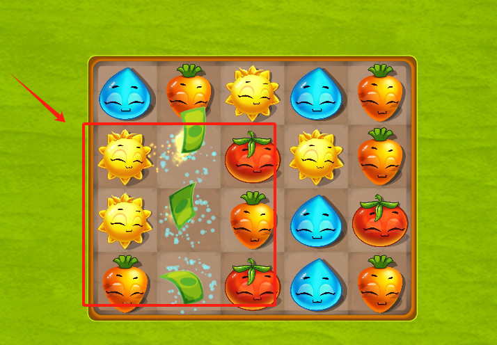 3、在棋盘游戏界面,点击红框区域里的太阳、胡萝卜等相同图案,即可消除这些图案并获得分数。