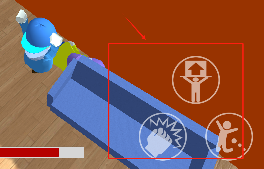 3、让蓝色小人在房间内站定,点击红框中的搬物、敲击或跳跃图标,通过灵活操作来完成闯关。