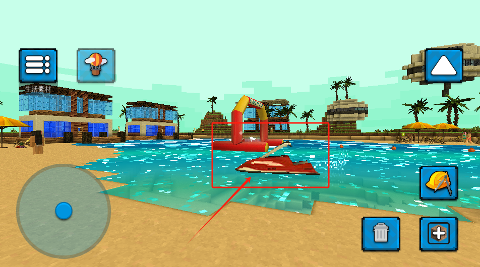 3、点击生活素材选项来选择建造物品,水上摩托停泊在蓝色的海水之中。