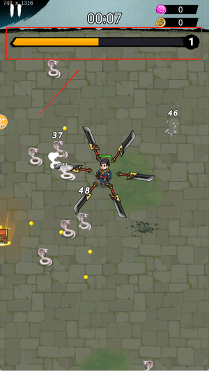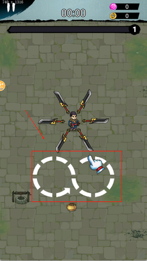 1、游戏开始时挑选初始装备进入关卡,通过滑动屏幕来操控角色移动,自动攻击系统会带动刀刃环绕角色旋转,以此消灭靠近的敌人。