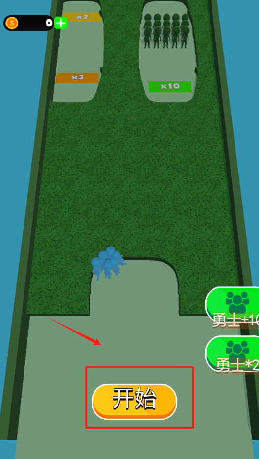 2、找到蓝色小人聚集的地方,点击右侧的“勇士+10”或“勇士×2”按钮来升级队伍。