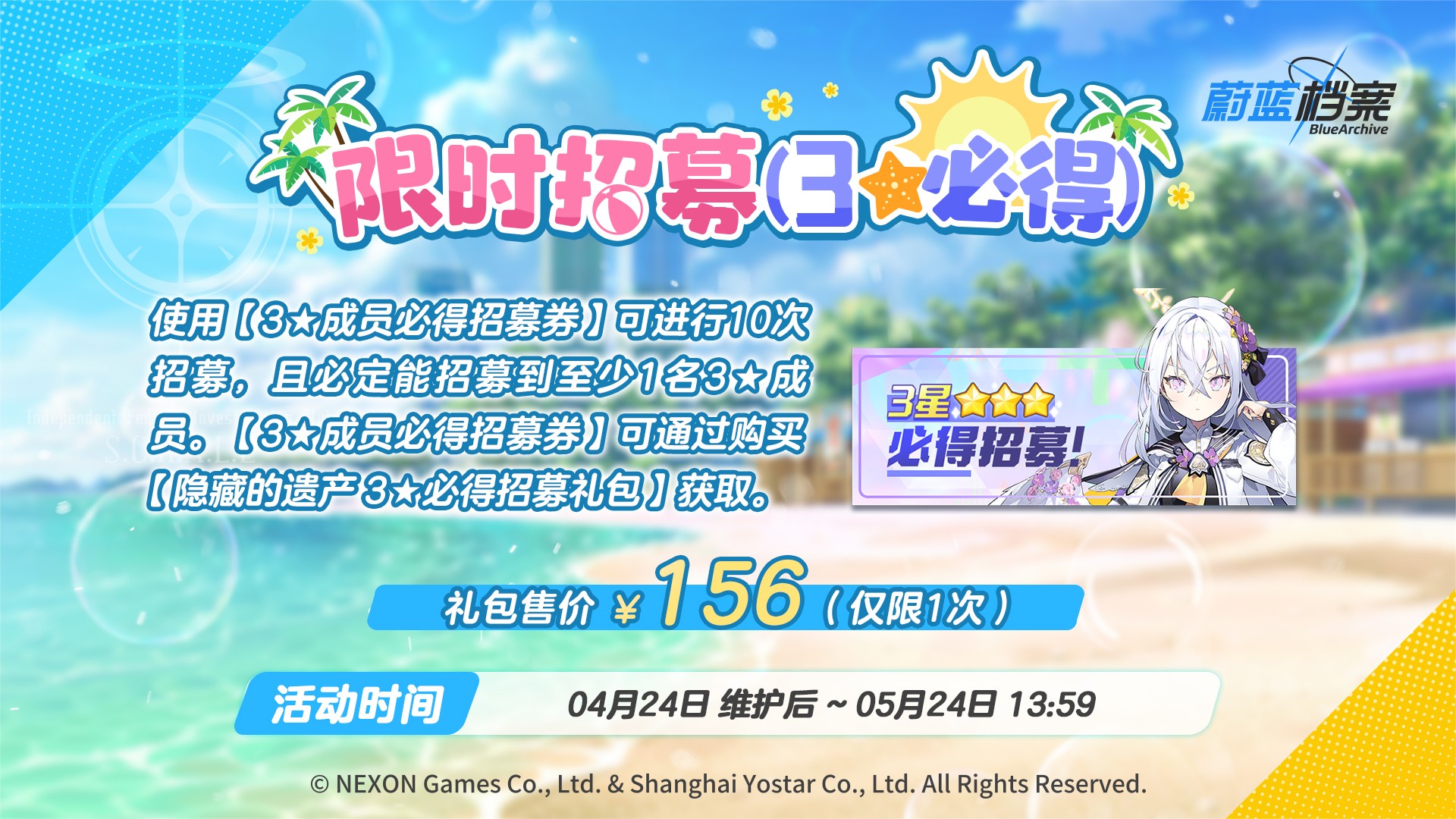 限时招募同步上线,3★限定成员“日向(泳装)”加入招募阵容。此次招募与忧(泳装)同时间开放至5月3日13:59,带来夏日海风中的清新角色体验。