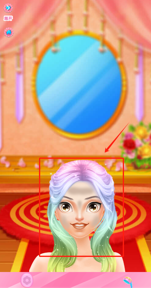 2、瞅见粉色帘子后的女孩头像,点红色方框里的头部区域,可以更换她的发型和发饰哦。