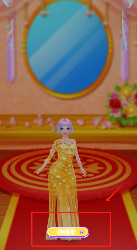 1、看到金裙紫粉发女孩站在红毯上,点下方开始装扮按钮,就能给她换装打扮啦。