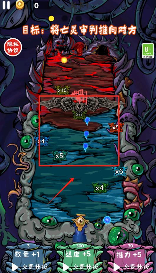 3、看到带有翅膀的骷髅图案和倍数标识时,调整角度滑动屏幕,将亡灵审判推向对面阵营即可。