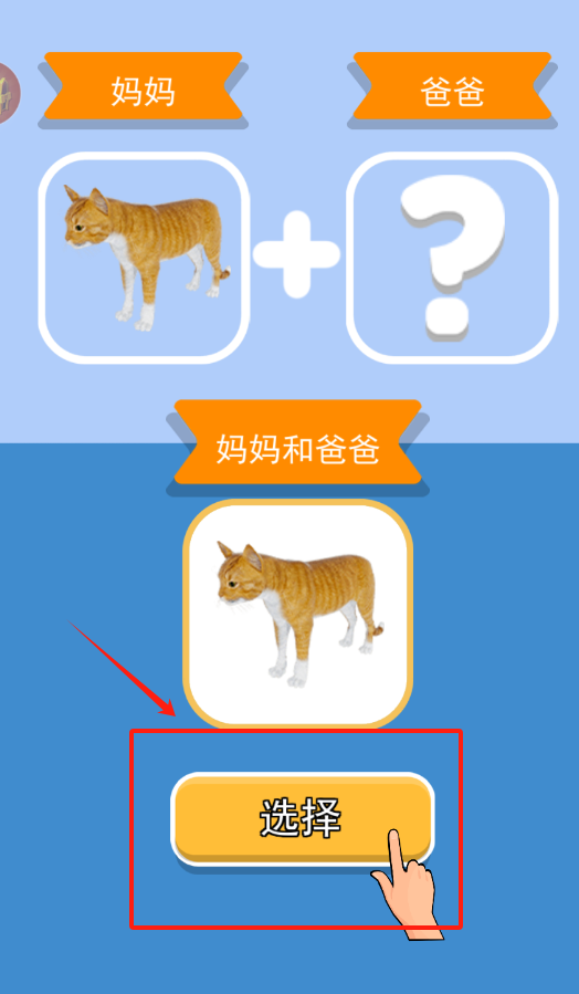 2、选妈妈和爸爸横幅下的小猫,再点黄色选择按钮确定组合。