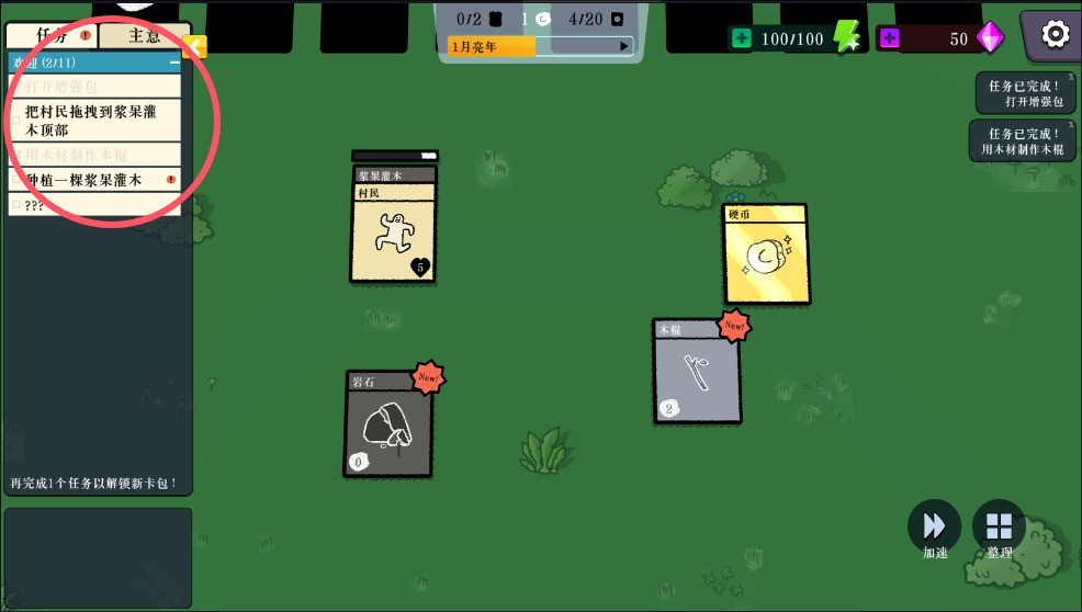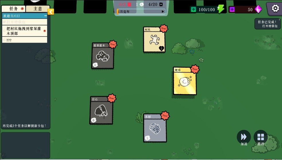 1、借助拖拽卡牌的方式,即可完成种植、建造、采集等各类操作,玩法颇具新意,操作简单易懂,能让玩家快速上手。