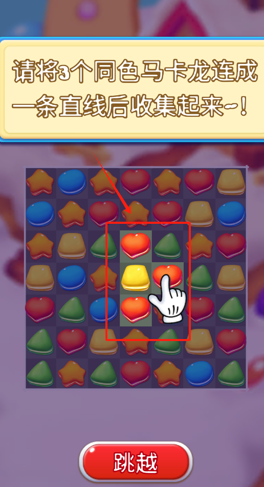 2、将三个相同颜色的马卡龙连成一条线,点击消除后要记得按跳跃键进入下一关。