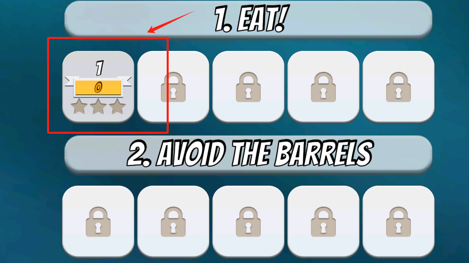 2、红框标出的第一个任务方块,数字1和三颗星亮着,赶紧点它开始吃的任务,其他方块还锁着。