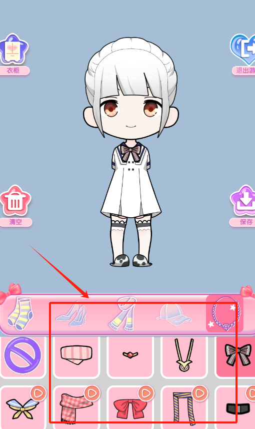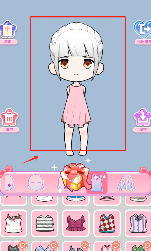 2、用红框框选穿白色衣服的女孩,可通过点击周围的图标更换衣服,也能直接点击保存按钮退出操作。