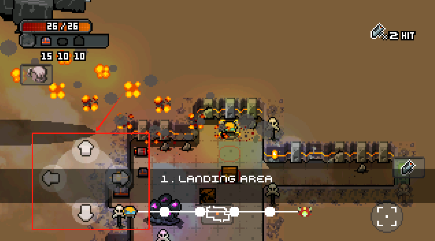 3、用底下方向键移动角色,注意左上角血量和资源,右边武器能攻击敌人,场景是登陆区。