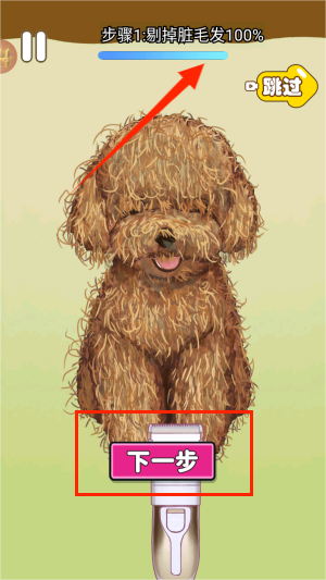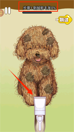 操作时需按照指引的顺序,借助底部工具栏中的清洁用品来为小狗打理毛发。