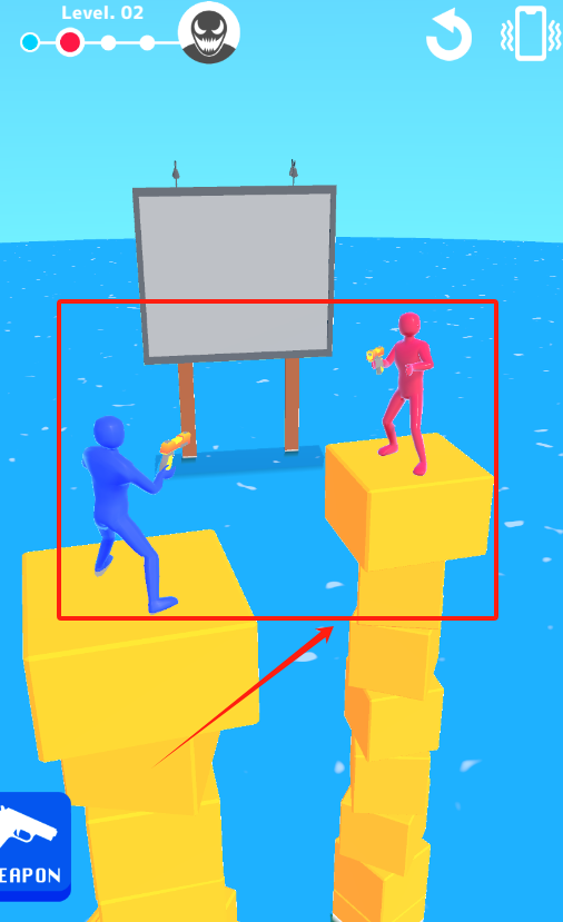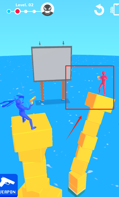 1、红蓝两人隔水对峙,赶紧找掩体躲好,瞄准对方弱点开枪,注意水面反射可能暴露位置。