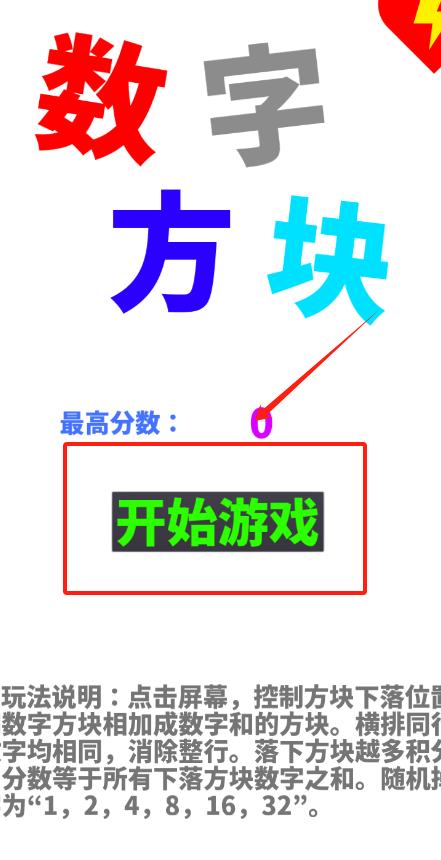 1、看到绿色开始游戏按钮没用手指点它,就能进入数字方块消除游戏啦。
