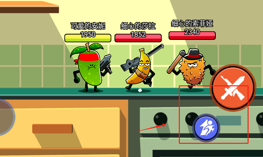 3、瞅瞅三个水果角色血量,点红框奔跑图标就能派角色上场打架哟。