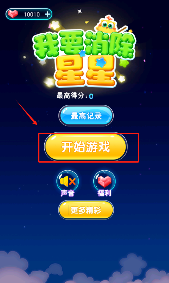 1、点击黄色的开始游戏按钮,即可进入星星消除关卡,挑战更高分数。