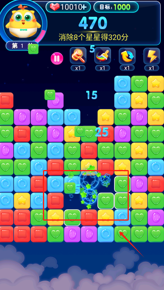 2、移动彩色星星方块,让相同的凑成三个就能消除得分,朝着1000分的目标冲刺吧。